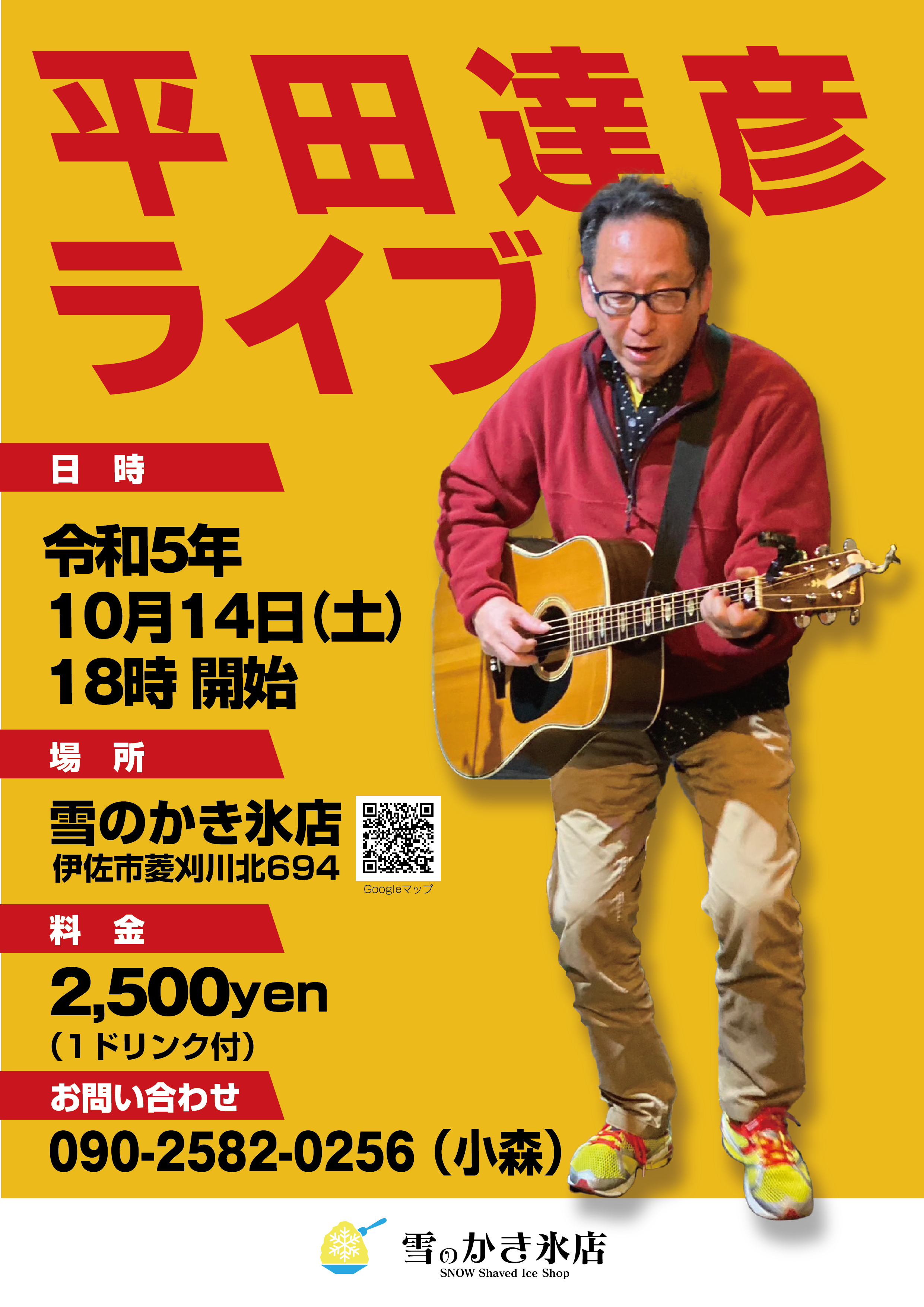 平田達彦さんライブ 令和5年10月14日(土) 18時 開始雪のかき氷店2500yen1ドリンク付き